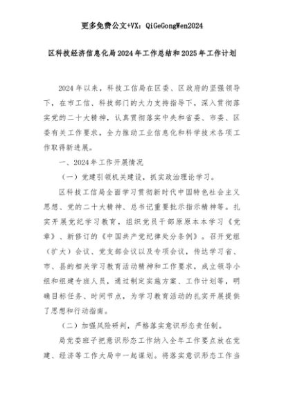 【七哥公文】2025年:区科技经济信息化局2024年工作总结和2025年工作计划+更多免费公文+VX:QiGeGongWen2024+更多免费公文+VX:QiGeGongWen2024