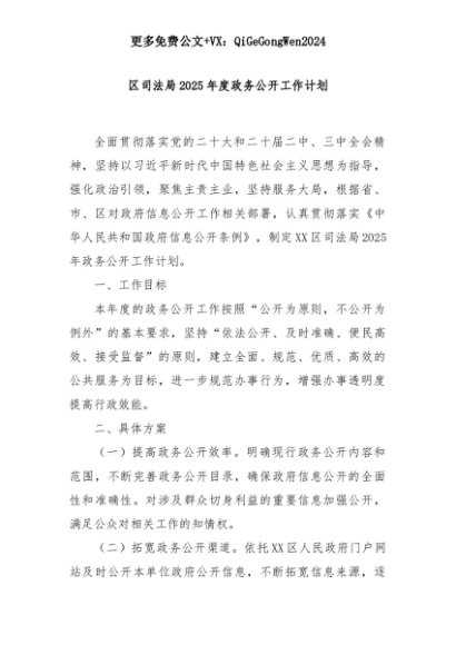 【七哥公文】2025年:区司法局2025年度政务公开工作计划+更多免费公文+VX:QiGeGongWen2024+更多免费公文+VX:QiGeGongWen2024