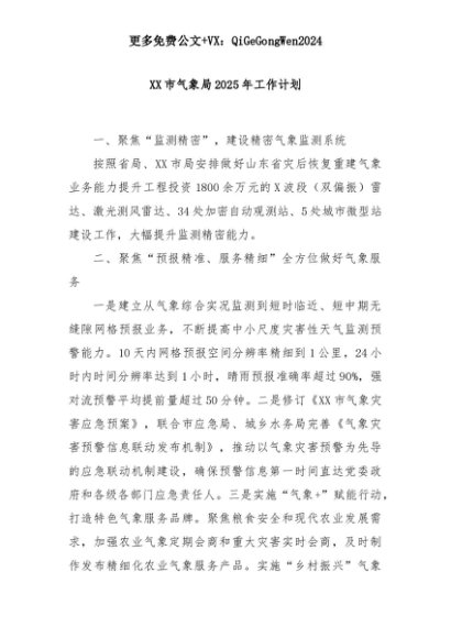 【七哥公文】2025年:XX市气象局2025年工作计划+更多免费公文+VX:QiGeGongWen2024+更多免费公文+VX:QiGeGongWen2024