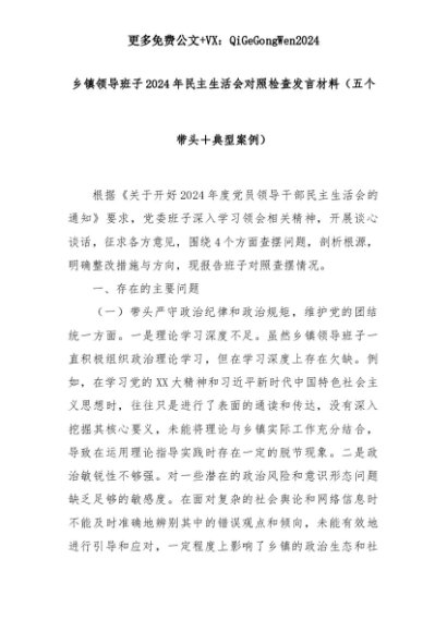 【七哥公文】2025年:乡镇领导班子2024年民主生活会对照检查发言材料(五个带头+典型案例)+更多免费公文+VX:QiGeGongWen2024+更多免费公文+VX:QiGeGongWen2024