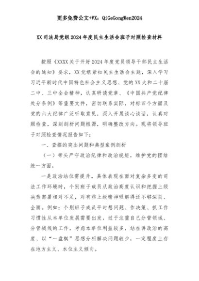 【七哥公文】2025年:XX司法局党组2024年度民主生活会班子对照检查材料+更多免费公文+VX:QiGeGongWen2024+更多免费公文+VX:QiGeGongWen2024