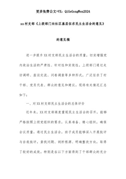 【七哥公文】2025年:xx村支部《上级部门向社区基层征求民主生活会的意见》的意见稿+更多免费公文+VX:QiGeGongWen2024+更多免费公文+VX:QiGeGongWen2024