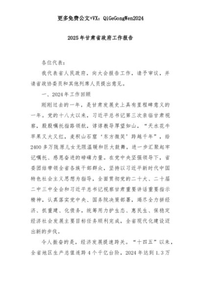 【七哥公文】2025年:2025年甘肃省政府工作报告+更多免费公文+VX:QiGeGongWen2024+更多免费公文+VX:QiGeGongWen2024