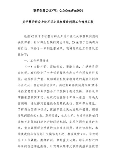 【七哥公文】2025年:关于整治群众身边不正之风和腐败问题工作情况汇报+更多免费公文+VX:QiGeGongWen2024+更多免费公文+VX:QiGeGongWen2024