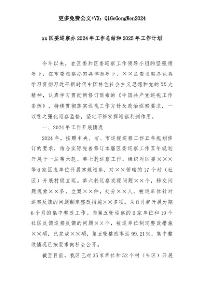 【七哥公文】2025年:xx区委巡察办2024年工作总结和2025年工作计划+更多免费公文+VX:QiGeGongWen2024+更多免费公文+VX:QiGeGongWen2024