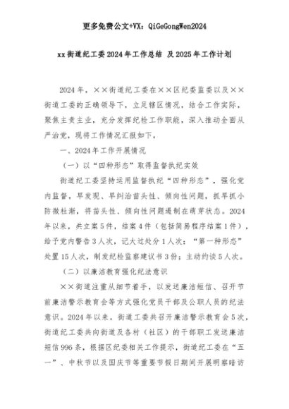 【七哥公文】2025年:xx街道纪工委2024年工作总结 及2025年工作计划+更多免费公文+VX:QiGeGongWen2024+更多免费公文+VX:QiGeGongWen2024