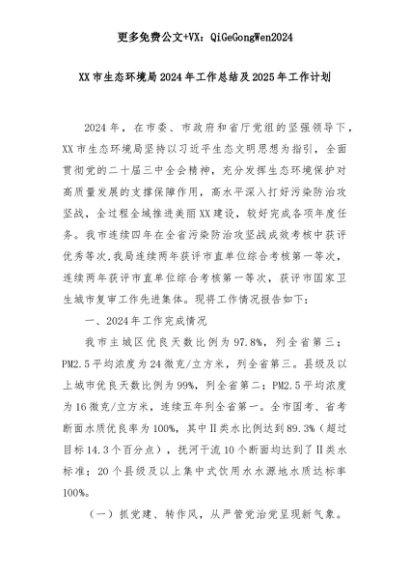 【七哥公文】2025年:XX市生态环境局2024年工作总结及2025年工作计划+更多免费公文+VX:QiGeGongWen2024+更多免费公文+VX:QiGeGongWen2024