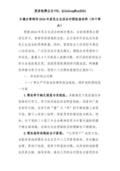 【七哥公文】2025年:乡镇分管领导2024年度民主生活会对照检查材料(四个带头)+更多免费公文+VX:QiGeGongWen2024+更多免费公文+VX:QiGeGongWen2024