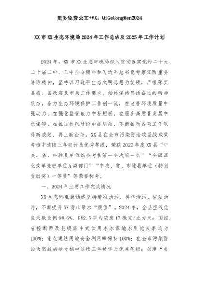 【七哥公文】2025年:XX市XX生态环境局2024年工作总结及2025年工作计划+更多免费公文+VX:QiGeGongWen2024+更多免费公文+VX:QiGeGongWen2024