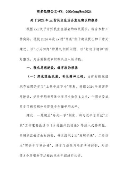 【七哥公文】2025年:关于2024年xx村民主生活会意见建议的报告+更多免费公文+VX:QiGeGongWen2024+更多免费公文+VX:QiGeGongWen2024