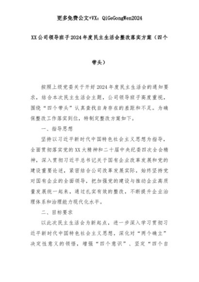 【七哥公文】2025年:XX公司领导班子2024年度民主生活会整改落实方案(四个带头)+更多免费公文+VX:QiGeGongWen2024+更多免费公文+VX:QiGeGongWen2024