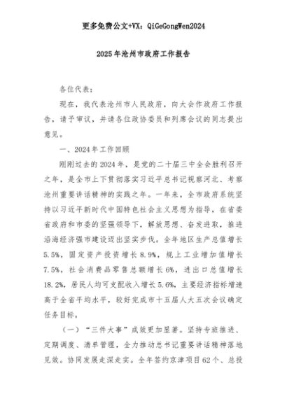 【七哥公文】2025年:2025年沧州市政府工作报告+更多免费公文+VX:QiGeGongWen2024+更多免费公文+VX:QiGeGongWen2024