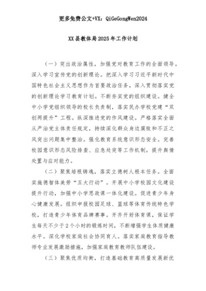 【七哥公文】2025年:XX县教体局2025年工作计划+更多免费公文+VX:QiGeGongWen2024+更多免费公文+VX:QiGeGongWen2024