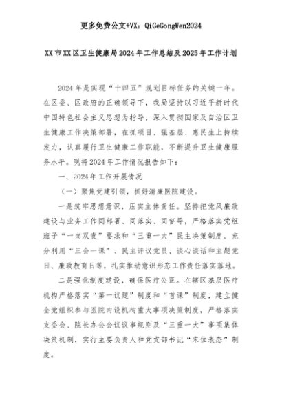 【七哥公文】2025年:XX市XX区卫生健康局2024年工作总结及2025年工作计划+更多免费公文+VX:QiGeGongWen2024+更多免费公文+VX:QiGeGongWen2024