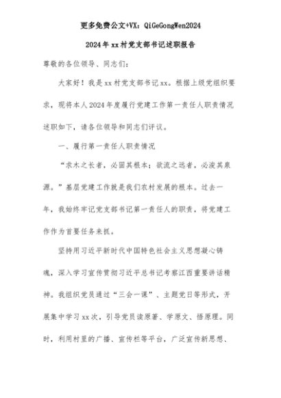 【七哥公文】2025年:2024 年 xx 村党支部书记述职报告+更多免费公文+VX:QiGeGongWen2024+更多免费公文+VX:QiGeGongWen2024