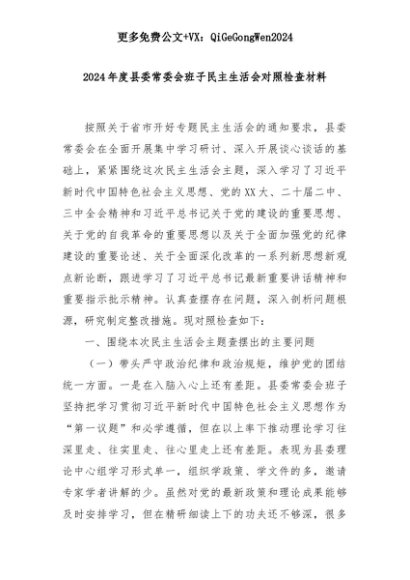 【七哥公文】2025年:2024年度县委常委会班子民主生活会对照检查材料+更多免费公文+VX:QiGeGongWen2024+更多免费公文+VX:QiGeGongWen2024