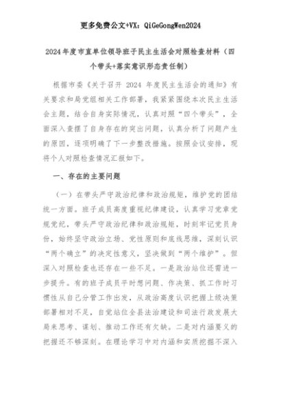 【七哥公文】2025年:2024年度市直单位领导班子民主生活会对照检查材料(四个带头+落实意识形态责任制)+更多免费公文+VX:QiGeGongWen2024+更多免费公文+VX:QiGeGongWen2024