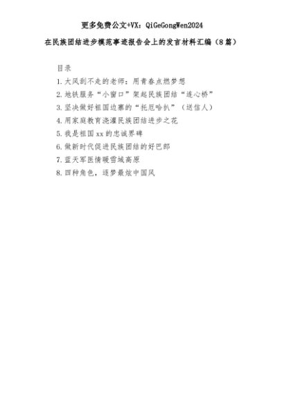 【七哥公文】2025年:(8篇)在民族团结进步模范事迹报告会上的发言材料汇编+更多免费公文+VX:QiGeGongWen2024+更多免费公文+VX:QiGeGongWen2024