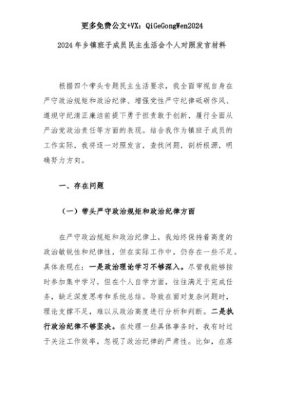 【七哥公文】2025年:2024年乡镇班子成员民主生活会个人对照发言材料+更多免费公文+VX:QiGeGongWen2024+更多免费公文+VX:QiGeGongWen2024