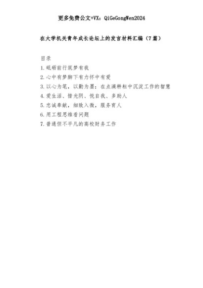 【七哥公文】2025年:(7篇)在大学机关青年成长论坛上的发言材料汇编+更多免费公文+VX:QiGeGongWen2024+更多免费公文+VX:QiGeGongWen2024