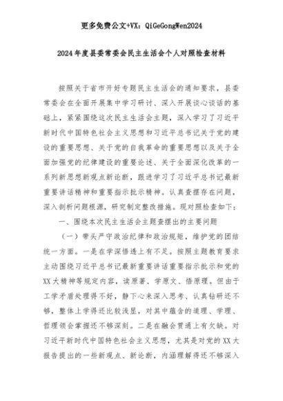 【七哥公文】2025年:2024年度县委常委会民主生活会个人对照检查材料+更多免费公文+VX:QiGeGongWen2024+更多免费公文+VX:QiGeGongWen2024