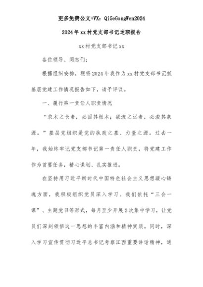 【七哥公文】2025年:2024 年 xx 村党支部书记述职报告(提升版)+更多免费公文+VX:QiGeGongWen2024+更多免费公文+VX:QiGeGongWen2024