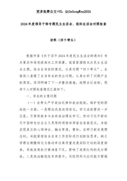 【七哥公文】2025年:2024年度领导干部专题民主生活会、组织生活会对照检查材料(四个带头)+更多免费公文+VX:QiGeGongWen2024+更多免费公文+VX:QiGeGongWen2024