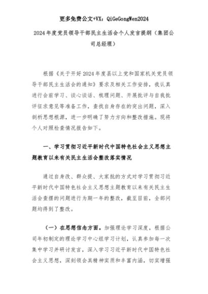 【七哥公文】2025年:2024年度党员领导干部民主生活会个人发言提纲(集团公司总经理)+更多免费公文+VX:QiGeGongWen2024+更多免费公文+VX:QiGeGongWen2024