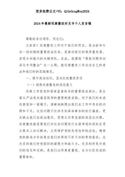 【七哥公文】2025年:2024年最新巡察整改村支书个人发言稿+更多免费公文+VX:QiGeGongWen2024+更多免费公文+VX:QiGeGongWen2024