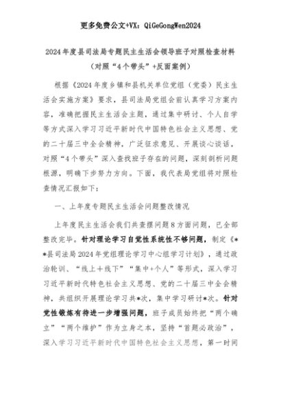 【七哥公文】2025年:2024年度县司法局专题民主生活会领导班子对照检查材料(对照“4个带头”+反面案例)+更多免费公文+VX:QiGeGongWen2024+更多免费公文+VX:QiGeGongWen2024