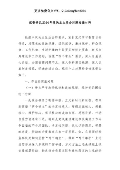 【七哥公文】2025年:纪委书记2024年度民主生活会对照检查材料+更多免费公文+VX:QiGeGongWen2024+更多免费公文+VX:QiGeGongWen2024
