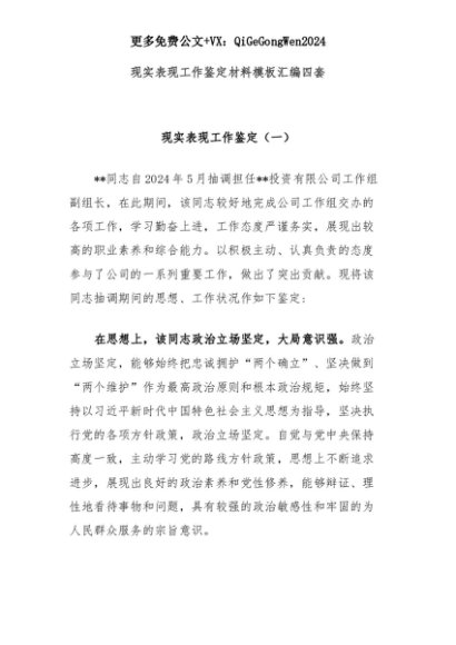【七哥公文】2025年:现实表现工作鉴定材料模板汇编四套+更多免费公文+VX:QiGeGongWen2024+更多免费公文+VX:QiGeGongWen2024