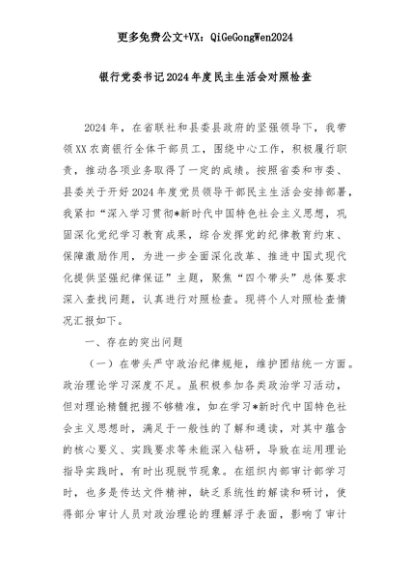 【七哥公文】2025年:银行党委书记2024年度民主生活会对照检查+更多免费公文+VX:QiGeGongWen2024+更多免费公文+VX:QiGeGongWen2024