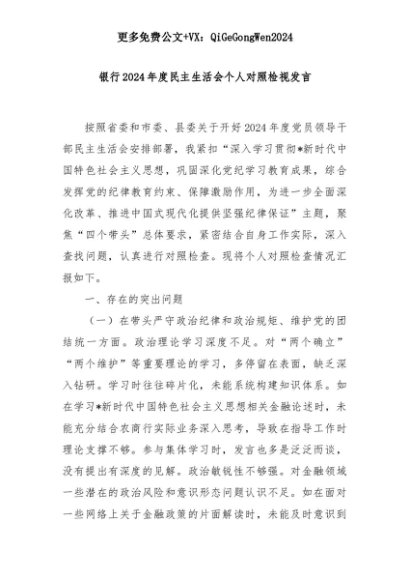 【七哥公文】2025年:银行2024年度民主生活会个人对照检视发言+更多免费公文+VX:QiGeGongWen2024+更多免费公文+VX:QiGeGongWen2024