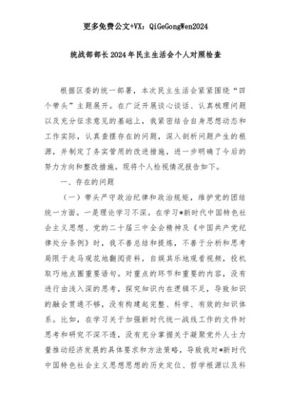 【七哥公文】2025年:统战部部长2024年民主生活会个人对照检查+更多免费公文+VX:QiGeGongWen2024+更多免费公文+VX:QiGeGongWen2024
