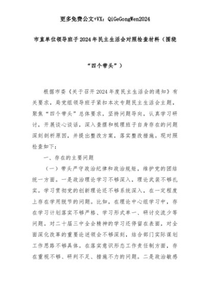 【七哥公文】2025年:市直单位领导班子2024年民主生活会对照检查材料(围绕“四个带头”)+更多免费公文+VX:QiGeGongWen2024+更多免费公文+VX:QiGeGongWen2024