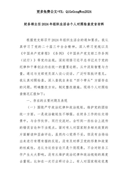 【七哥公文】2025年:财务部主任2024年组织生活会个人对照检查发言材料+更多免费公文+VX:QiGeGongWen2024+更多免费公文+VX:QiGeGongWen2024
