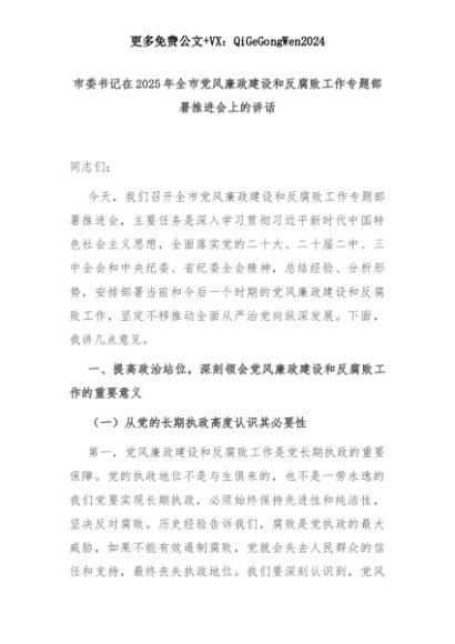【七哥公文】2025年:市委书记在2025年全市党风廉政建设和反腐败工作专题部署推进会上的讲话+更多免费公文+VX:QiGeGongWen2024+更多免费公文+VX:QiGeGongWen2024