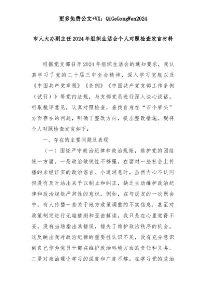 【七哥公文】2025年:市人大办副主任2024年组织生活会个人对照检查发言材料+更多免费公文+VX:QiGeGongWen2024+更多免费公文+VX:QiGeGongWen2024