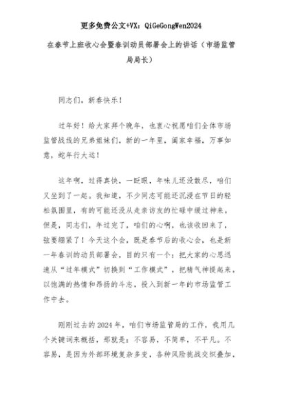 【七哥公文】2025年:在春节上班收心会暨春训动员部署会上的讲话(市场监管局局长)+更多免费公文+VX:QiGeGongWen2024+更多免费公文+VX:QiGeGongWen2024