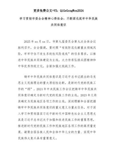 【七哥公文】2025年:学习贯彻市委全会精神心得体会:不断深化筑牢中华民族共同体意识+更多免费公文+VX:QiGeGongWen2024+更多免费公文+VX:QiGeGongWen2024