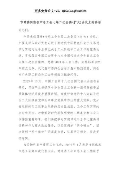 【七哥公文】2025年:市常委同志在市总工会七届二次全委(扩大)会议上的讲话+更多免费公文+VX:QiGeGongWen2024+更多免费公文+VX:QiGeGongWen2024