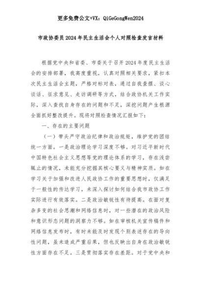 【七哥公文】2025年:市政协委员2024年民主生活会个人对照检查发言材料+更多免费公文+VX:QiGeGongWen2024+更多免费公文+VX:QiGeGongWen2024