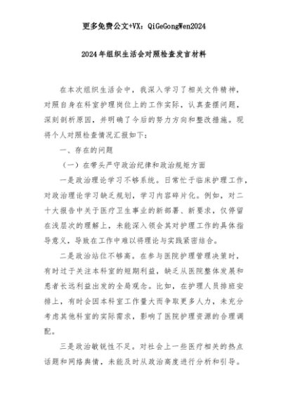 【七哥公文】2025年:2024年组织生活会对照检查发言材料+更多免费公文+VX:QiGeGongWen2024+更多免费公文+VX:QiGeGongWen2024