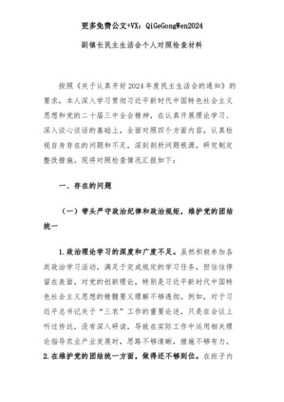 【七哥公文】2025年:副镇长民主生活会个人对照检查材料+更多免费公文+VX:QiGeGongWen2024+更多免费公文+VX:QiGeGongWen2024
