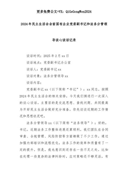 【七哥公文】2025年:2024年民主生活会会前国有企业党委副书记和法务分管领导谈心谈话记录+更多免费公文+VX:QiGeGongWen2024+更多免费公文+VX:QiGeGongWen2024