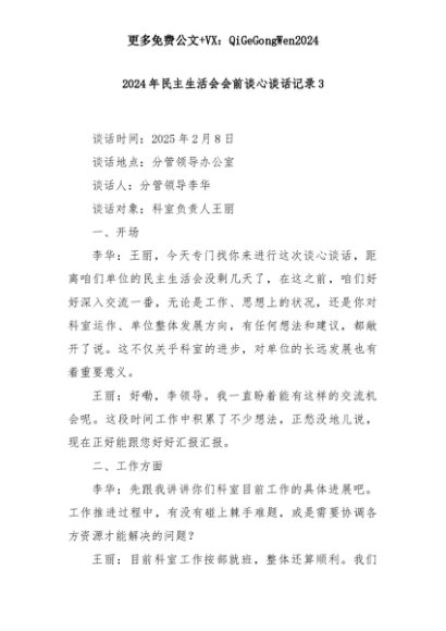【七哥公文】2025年:2024年民主生活会会前谈心谈话记录3+更多免费公文+VX:QiGeGongWen2024+更多免费公文+VX:QiGeGongWen2024