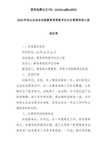 【七哥公文】2025年:2024年民主生活会会前教育局党组书记与分管领导谈心谈话记录+更多免费公文+VX:QiGeGongWen2024+更多免费公文+VX:QiGeGongWen2024