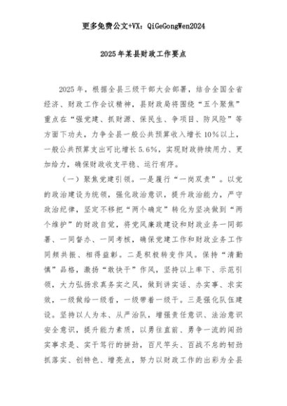 【七哥公文】2025年:2025年某县财政工作要点+更多免费公文+VX:QiGeGongWen2024+更多免费公文+VX:QiGeGongWen2024