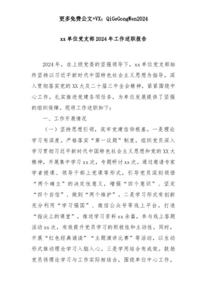 【七哥公文】2025年:xx单位党支部2024年工作述职报告+更多免费公文+VX:QiGeGongWen2024+更多免费公文+VX:QiGeGongWen2024